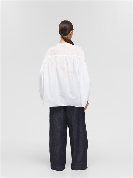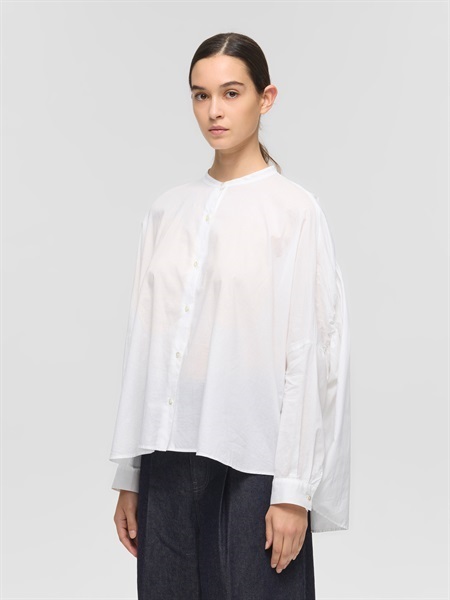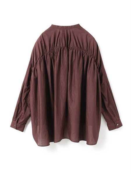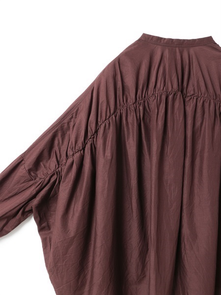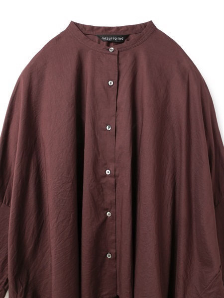mizuiro ind 經典人氣款襯衫。正面為立領設計,風格簡潔俐落,背部大面積打褶營造出圓潤立體的輪廓,展現富有氛圍感、令人印象深刻的穿搭效果。極寬的身幅搭配無肩線剪裁,不特別強調身形曲線,形成隨性自然的寬鬆剪影,也是本款的魅力所在。前後長度略有差異的下擺設計,讓整體線條更顯柔和,散發女性柔美氣質。無論搭配清爽俐落的下身單品,或是具有份量感的寬鬆下著,都能展現不同風格的女性魅力,是不挑下身、實穿度極高的輪廓設計。採用帶有透膚感的輕薄棉質布料,質地清爽舒適,炎熱季節可作為外搭罩衫,涼爽時節則可作為內搭單品,適合長季節穿著。※新增 lavender 30 / l.gray 90 / s.pink 41a(2025.04.15)※追加新色 ivory 12 / c.c gray 92(2025.08.07)※追加新色 p.c gray 32(2025.08.20)※追加新色 kinari 13 / green 22 / s.pink 41 / navy 77(2025.12.31)背褶寬版襯衫NO: 1-238975