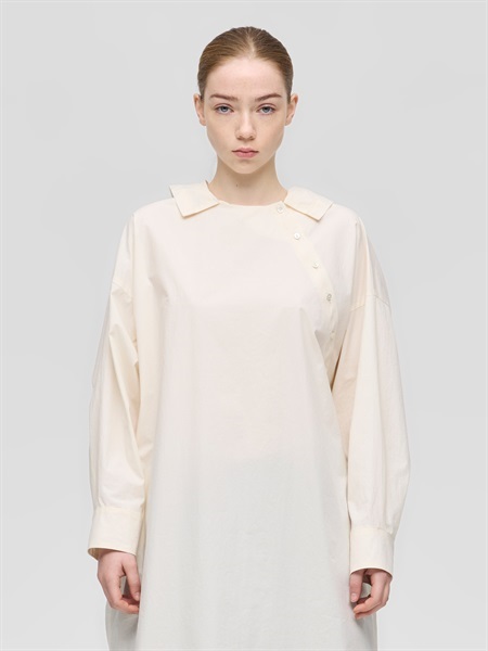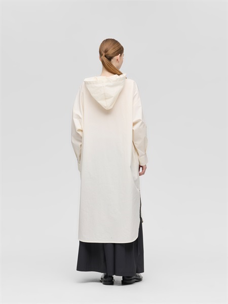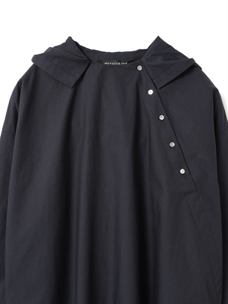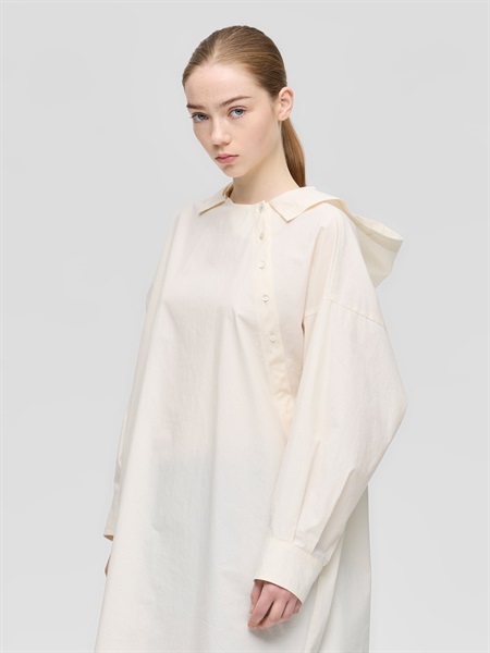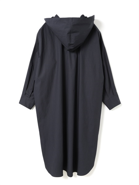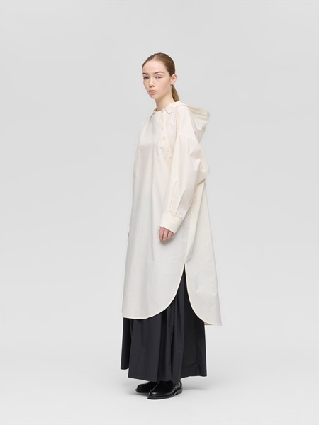 這款連帽洋裝以斜排鈕扣與領口般的帽子設計展現獨特的印象。 選用帶有工裝質感經壓縮加工的高密度素材的布料,兼具適中的厚度與挺度,展現帶有軍裝般的質感。 整體為剪裁寬鬆,圓弧下擺搭配深側開衩與袖口立體感的設計,與褲裝或裙裝搭配都能保持完美比例,營造優雅隨性又有型的休閒風格。 隨著穿著次數增加,布料質感越柔軟自然,是耐久且令人喜愛的款式。 米色款採用天然原棉,保留天然紋理,散發自然樸實的魅力。 右側設有側邊口袋,方便實用。同款材質也推出了襯衫開襟毛衣(1-230167 / shrt C/D)。連帽連衣裙NO:1-250086