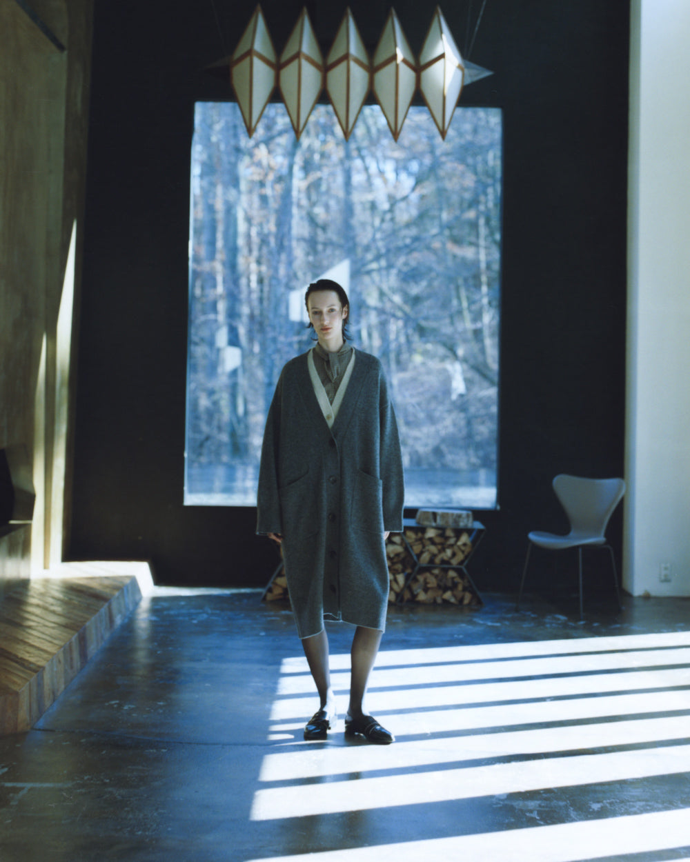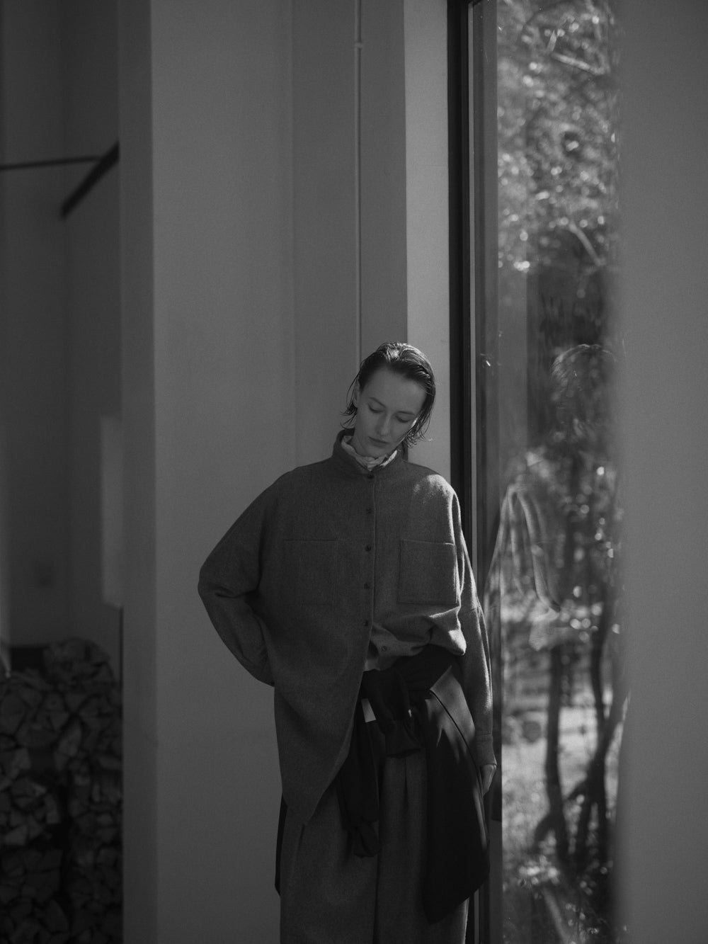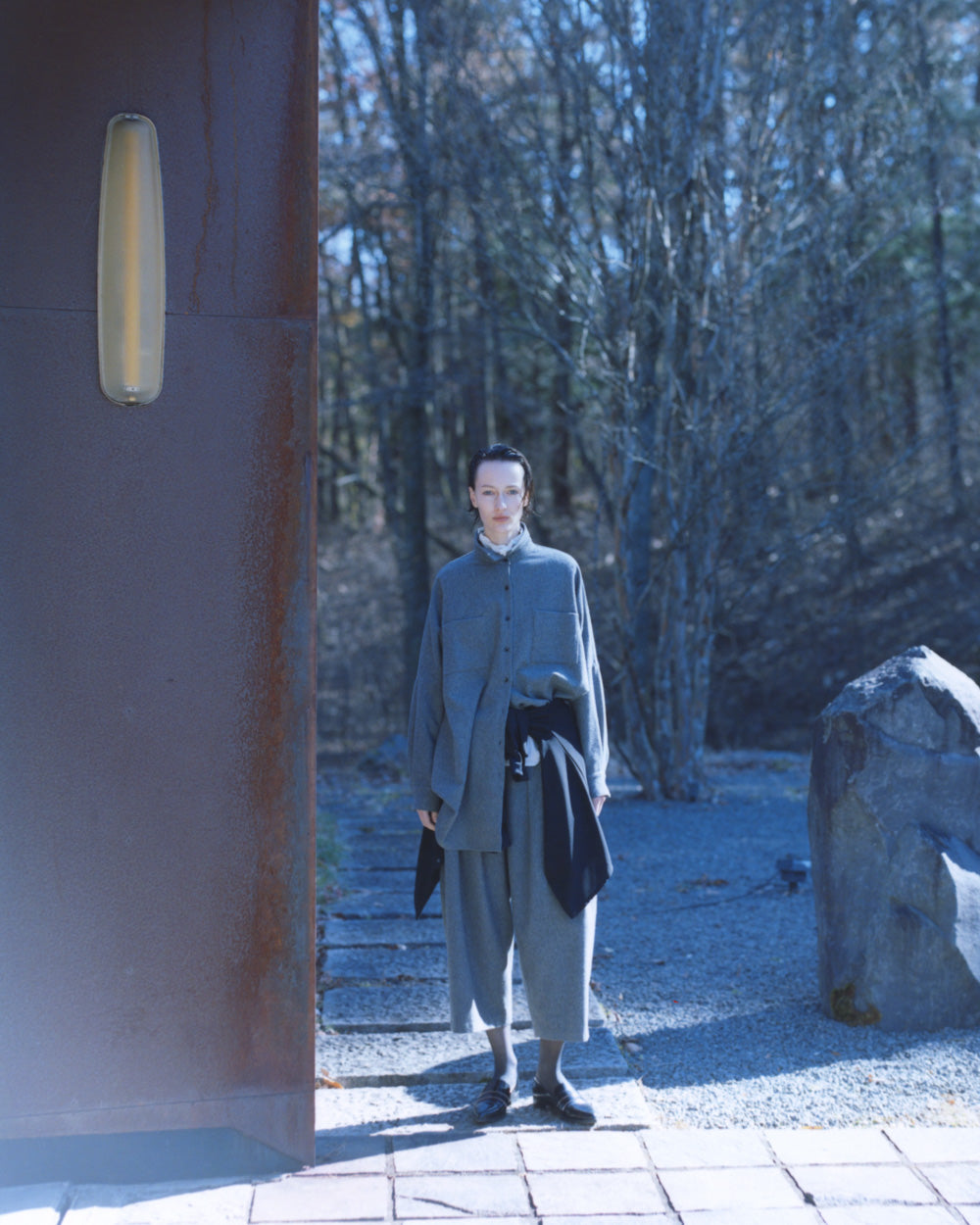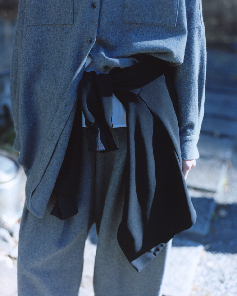 - 柔和灰色的成套造型,以黑色的細微層次收緊輪廓。