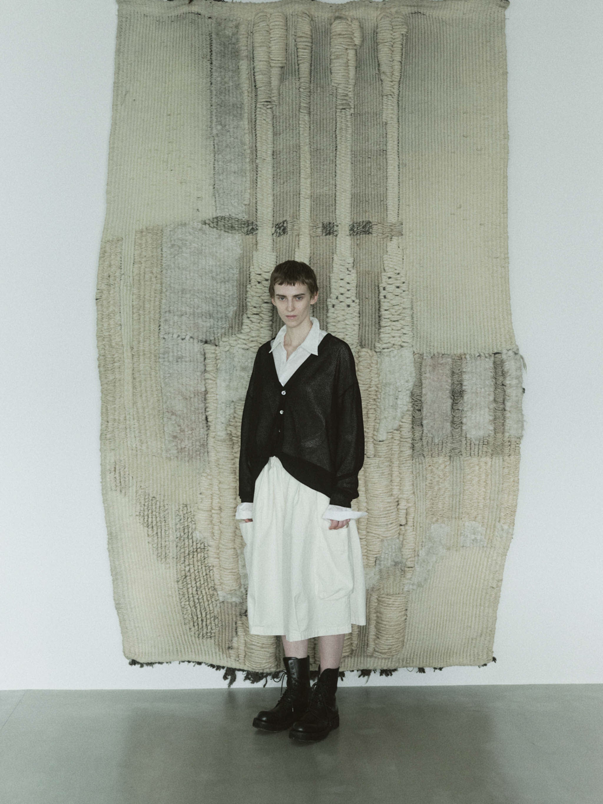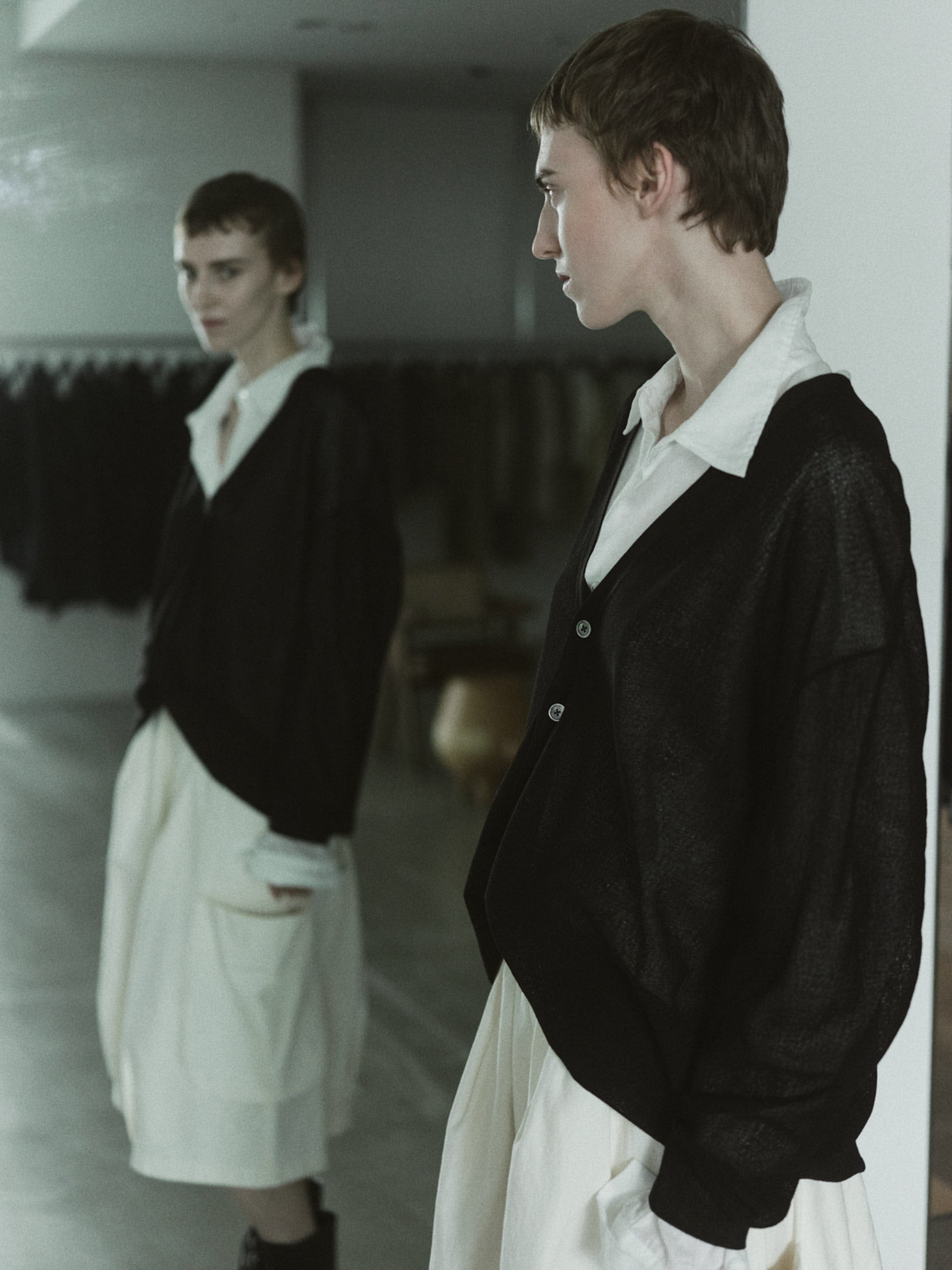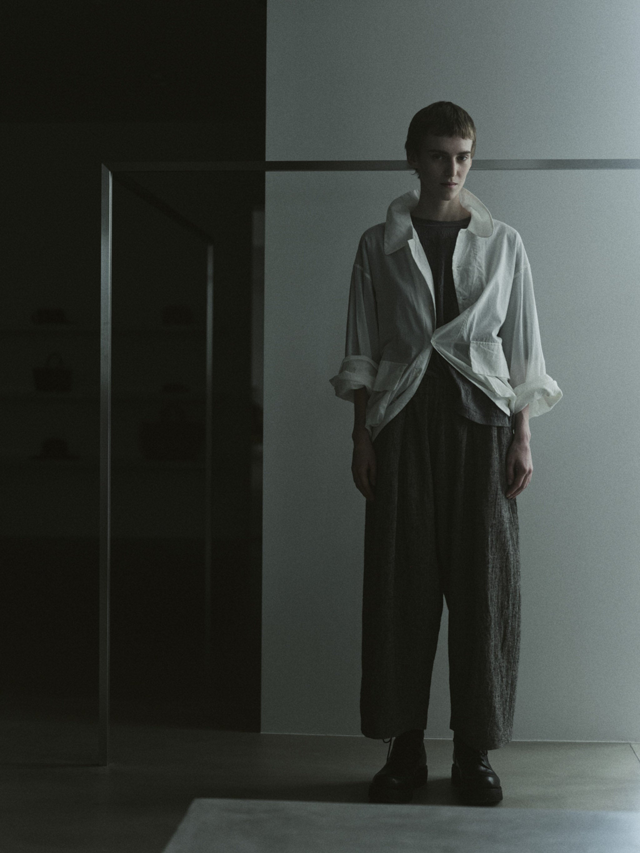 輕盈如空氣般的襯衫,搭配帶有視覺體量的灰色同調色系款式。 柔軟與厚重的交錯,細膩的陰影悄然流動。